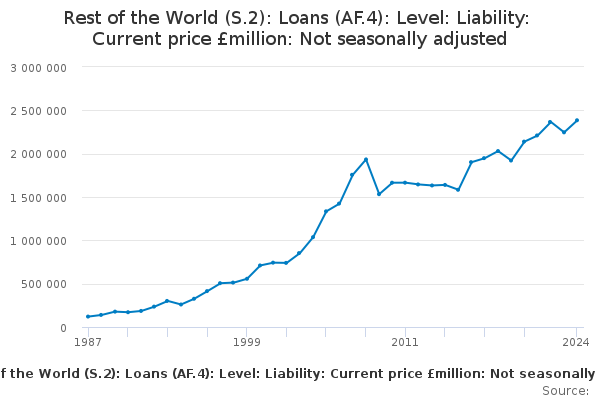 Download this time seriesRest of the World (S.2): Loans (AF.4): Level: Liability: Current price £million: Not seasonally adjusted
