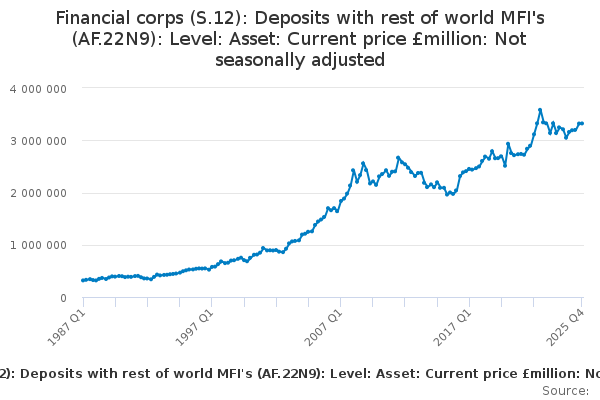 Download this time seriesFinancial corps (S.12): Deposits with rest of world MFI's (AF.22N9): Level: Asset: Current price £million: Not seasonally adjusted