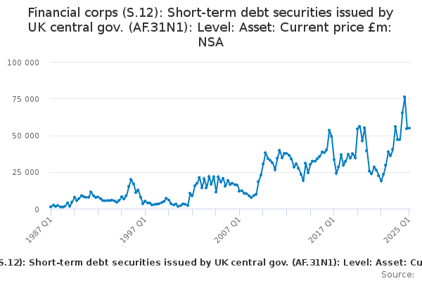 Download this time seriesFinancial corps (S.12): Short-term debt securities issued by UK central gov. (AF.31N1): Level: Asset: Current price £m: NSA