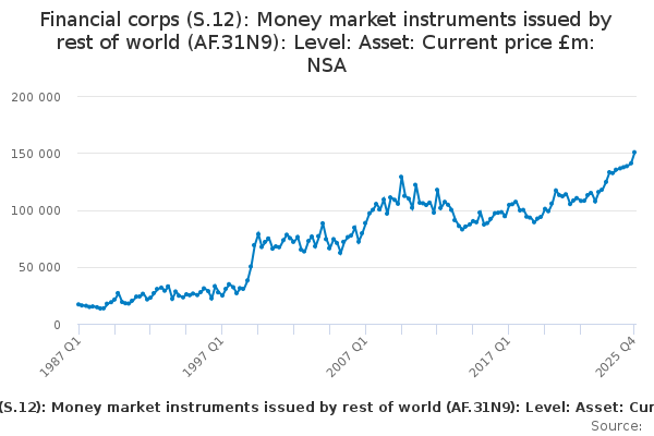 Download this time seriesFinancial corps (S.12): Money market instruments issued by rest of world (AF.31N9): Level: Asset: Current price £m: NSA