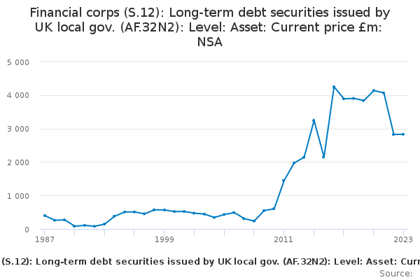Download this time seriesFinancial corps (S.12): Long-term debt securities issued by UK local gov. (AF.32N2): Level: Asset: Current price £m: NSA