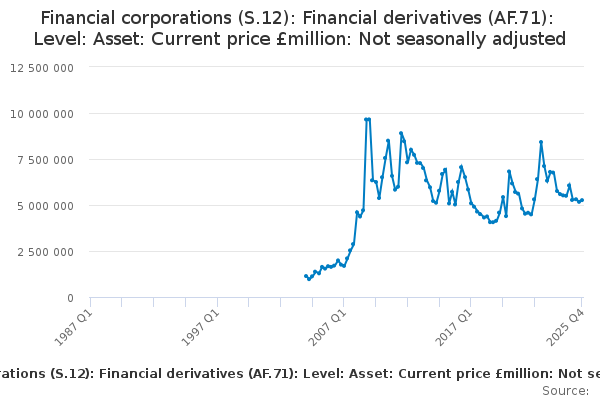 Download this time seriesFinancial corporations (S.12): Financial derivatives (AF.71): Level: Asset: Current price £million: Not seasonally adjusted