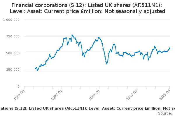 Download this time seriesFinancial corporations (S.12): Listed UK shares (AF.511N1): Level: Asset: Current price £million: Not seasonally adjusted