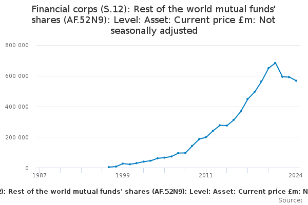 Download this time seriesFinancial corps (S.12): Rest of the world mutual funds' shares (AF.52N9): Level: Asset: Current price £m: Not seasonally adjusted