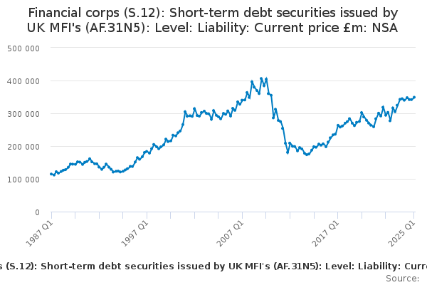 Download this time seriesFinancial corps (S.12): Short-term debt securities issued by UK MFI's (AF.31N5): Level: Liability: Current price £m: NSA