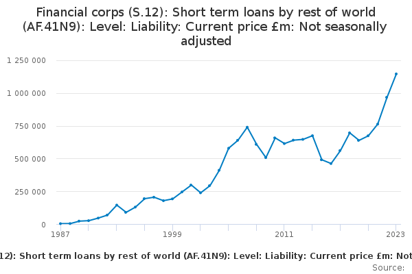 Download this time seriesFinancial corps (S.12): Short term loans by rest of world (AF.41N9): Level: Liability: Current price £m: Not seasonally adjusted