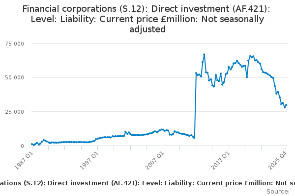 Download this time seriesFinancial corporations (S.12): Direct investment (AF.421): Level: Liability: Current price £million: Not seasonally adjusted
