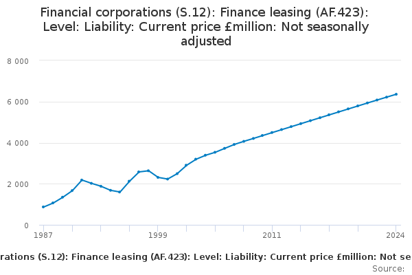 Download this time seriesFinancial corporations (S.12): Finance leasing (AF.423): Level: Liability: Current price £million: Not seasonally adjusted