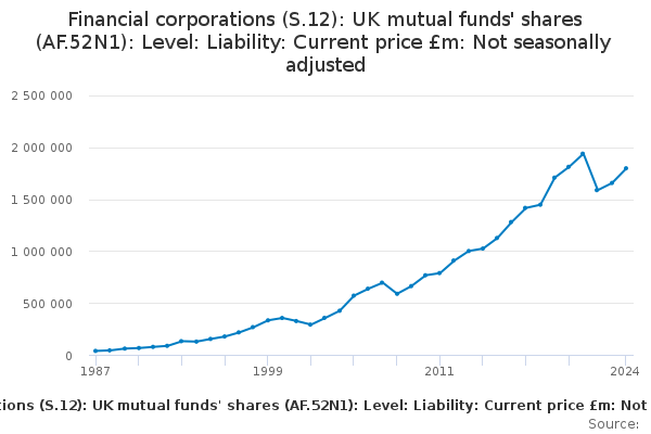 Download this time seriesFinancial corporations (S.12): UK mutual funds' shares (AF.52N1): Level: Liability: Current price £m: Not seasonally adjusted