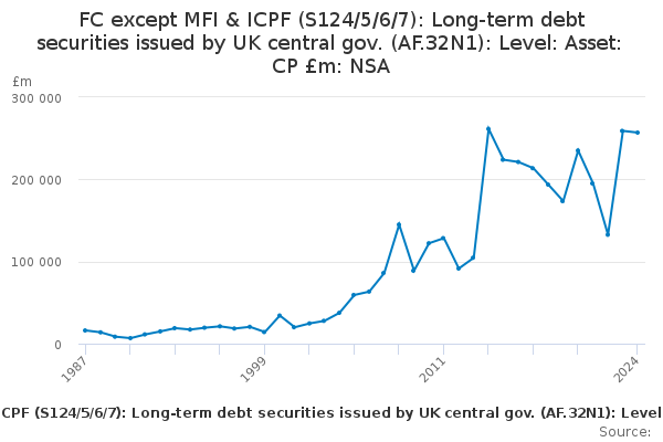 Download this time seriesFC except MFI & ICPF (S124/5/6/7): Long-term debt securities issued by UK central gov. (AF.32N1): Level: Asset: CP £m: NSA