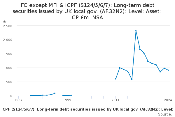 Download this time seriesFC except MFI & ICPF (S124/5/6/7): Long-term debt securities issued by UK local gov. (AF.32N2): Level: Asset: CP £m: NSA