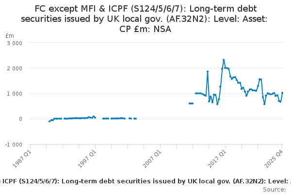 Download this time seriesFC except MFI & ICPF (S124/5/6/7): Long-term debt securities issued by UK local gov. (AF.32N2): Level: Asset: CP £m: NSA