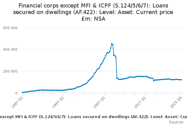 Download this time seriesFinancial corps except MFI & ICPF (S.124/5/6/7): Loans secured on dwellings (AF.422): Level: Asset: Current price £m: NSA