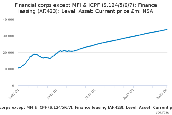 Download this time seriesFinancial corps except MFI & ICPF (S.124/5/6/7): Finance leasing (AF.423): Level: Asset: Current price £m: NSA