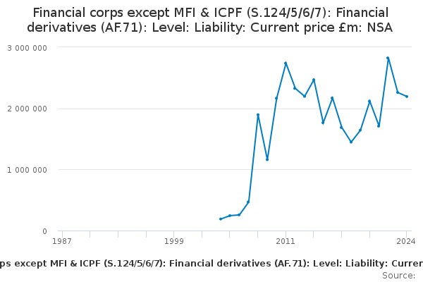Download this time seriesFinancial corps except MFI & ICPF (S.124/5/6/7): Financial derivatives (AF.71): Level: Liability: Current price £m: NSA