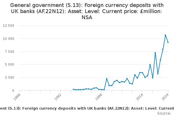 Download this time seriesGeneral government (S.13): Foreign currency deposits with UK banks (AF.22N12): Asset: Level: Current price: £million: NSA