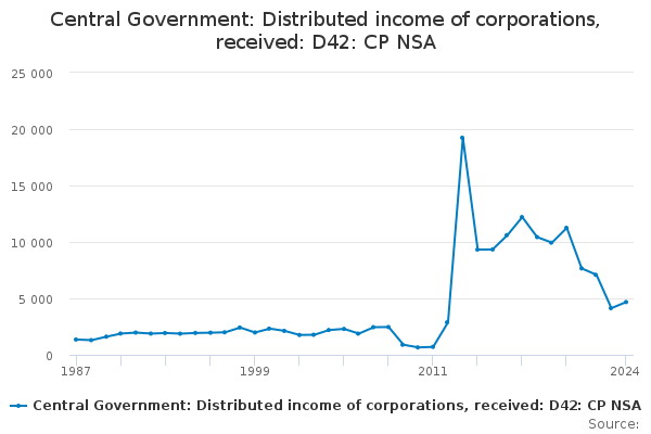 Download this time seriesCentral Government: Distributed income of corporations, received: D42: CP NSA