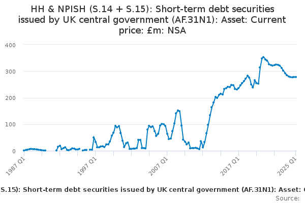 Download this time seriesHH & NPISH (S.14 + S.15): Short-term debt securities issued by UK central government (AF.31N1): Asset: Current price: £m: NSA