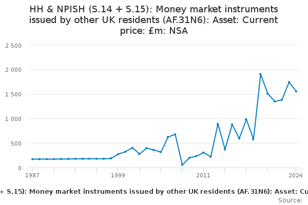 Download this time seriesHH & NPISH (S.14 + S.15): Money market instruments issued by other UK residents (AF.31N6): Asset: Current price: £m: NSA