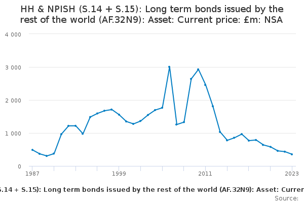 Download this time seriesHH & NPISH (S.14 + S.15): Long term bonds issued by the rest of the world (AF.32N9): Asset: Current price: £m: NSA