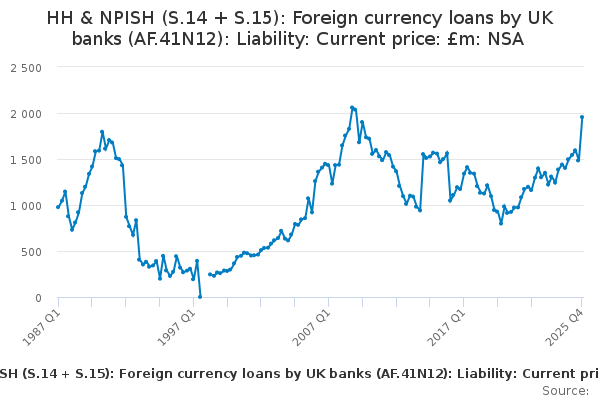 Download this time seriesHH & NPISH (S.14 + S.15): Foreign currency loans by UK banks (AF.41N12): Liability: Current price: £m: NSA