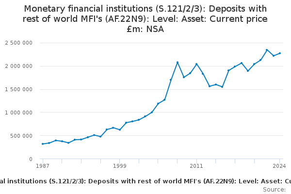 Download this time seriesMonetary financial institutions (S.121/2/3): Deposits with rest of world MFI's (AF.22N9): Level: Asset: Current price £m: NSA