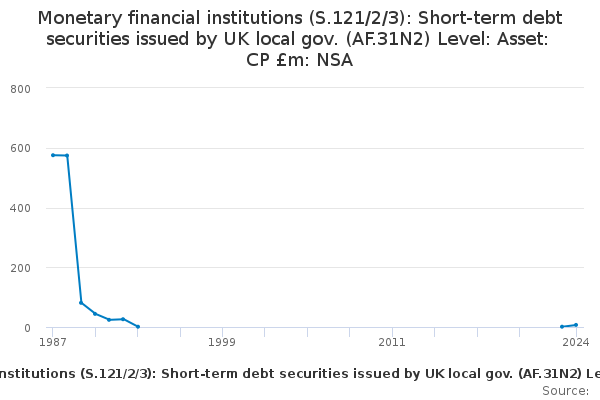 Download this time seriesMonetary financial institutions (S.121/2/3): Short-term debt securities issued by UK local gov. (AF.31N2) Level: Asset: CP £m: NSA