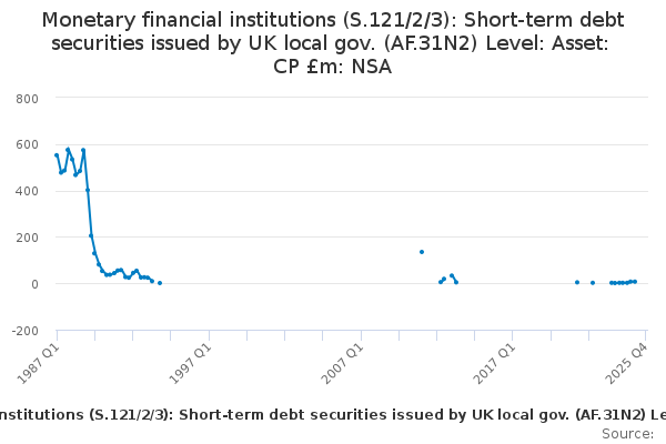 Download this time seriesMonetary financial institutions (S.121/2/3): Short-term debt securities issued by UK local gov. (AF.31N2) Level: Asset: CP £m: NSA