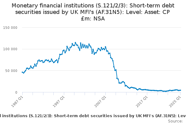 Download this time seriesMonetary financial institutions (S.121/2/3): Short-term debt securities issued by UK MFI's (AF.31N5): Level: Asset: CP £m: NSA