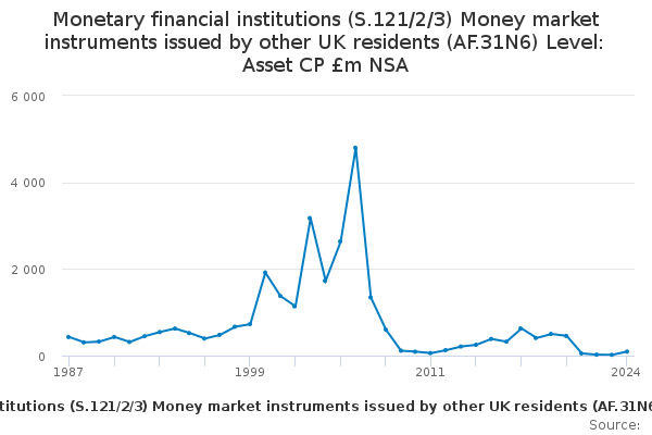 Download this time seriesMonetary financial institutions (S.121/2/3) Money market instruments issued by other UK residents (AF.31N6) Level: Asset CP £m NSA