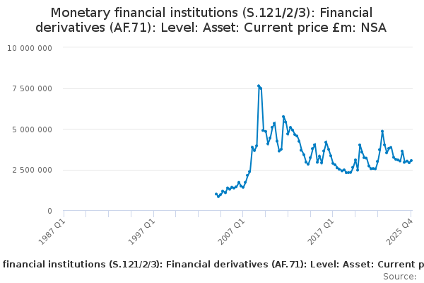 Download this time seriesMonetary financial institutions (S.121/2/3): Financial derivatives (AF.71): Level: Asset: Current price £m: NSA