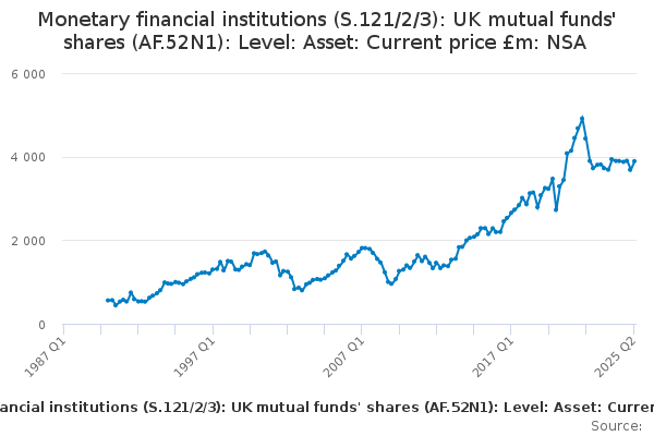 Download this time seriesMonetary financial institutions (S.121/2/3): UK mutual funds' shares (AF.52N1): Level: Asset: Current price £m: NSA