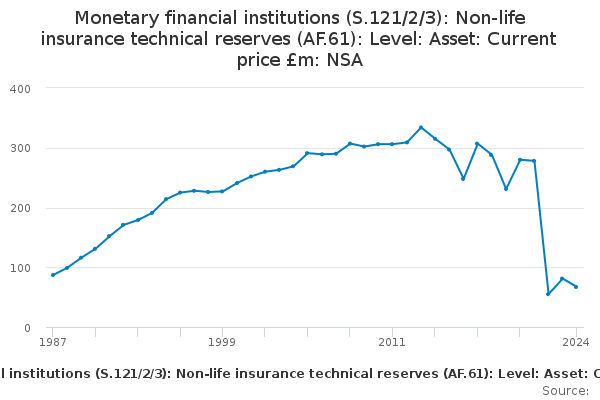 Download this time seriesMonetary financial institutions (S.121/2/3): Non-life insurance technical reserves (AF.61): Level: Asset: Current price £m: NSA