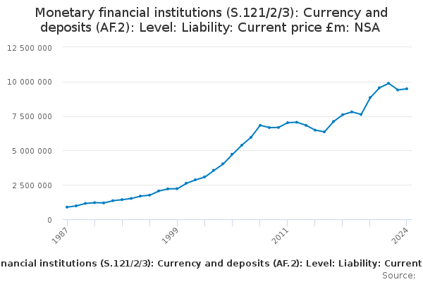 Download this time seriesMonetary financial institutions (S.121/2/3): Currency and deposits (AF.2): Level: Liability: Current price £m: NSA