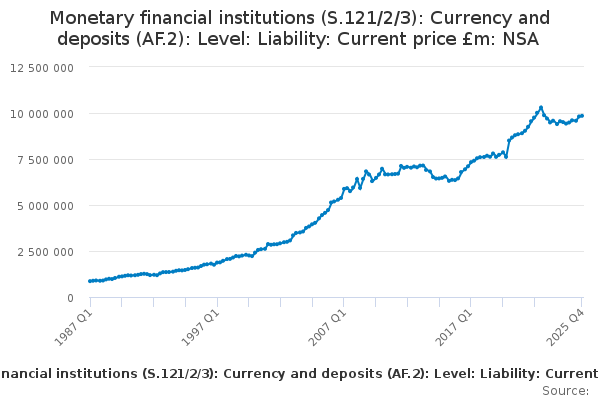Download this time seriesMonetary financial institutions (S.121/2/3): Currency and deposits (AF.2): Level: Liability: Current price £m: NSA