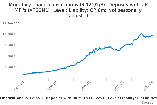 Download this time seriesMonetary financial institutions (S.121/2/3): Deposits with UK MFI's (AF.22N1): Level: Liability: CP £m: Not seasonally adjusted