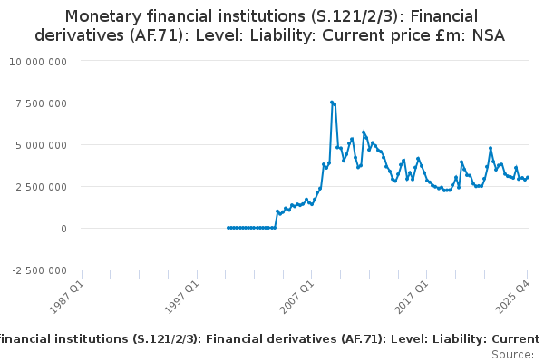 Download this time seriesMonetary financial institutions (S.121/2/3): Financial derivatives (AF.71): Level: Liability: Current price £m: NSA