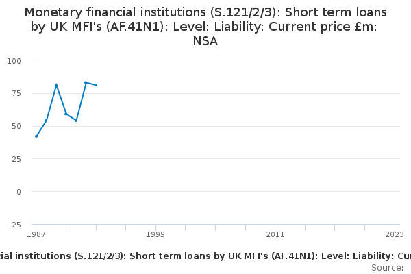 Download this time seriesMonetary financial institutions (S.121/2/3): Short term loans by UK MFI's (AF.41N1): Level: Liability: Current price £m: NSA