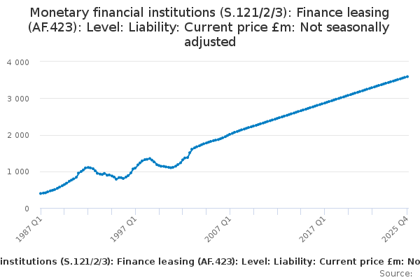 Download this time seriesMonetary financial institutions (S.121/2/3): Finance leasing (AF.423): Level: Liability: Current price £m: Not seasonally adjusted