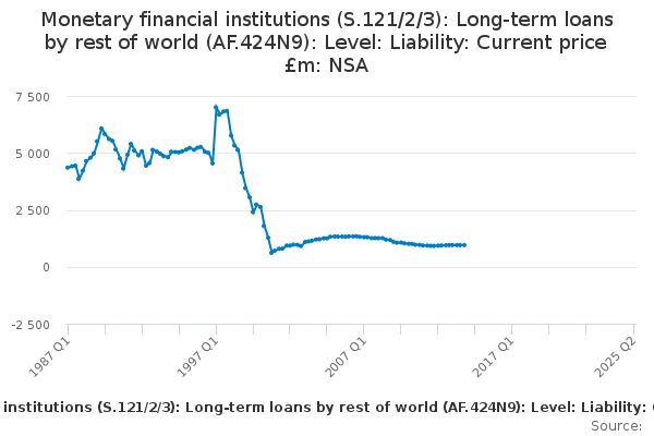 Download this time seriesMonetary financial institutions (S.121/2/3): Long-term loans by rest of world (AF.424N9): Level: Liability: Current price £m: NSA