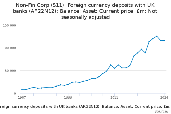 Download this time seriesNon-Fin Corp (S11): Foreign currency deposits with UK banks (AF.22N12): Balance: Asset: Current price: £m: Not seasonally adjusted