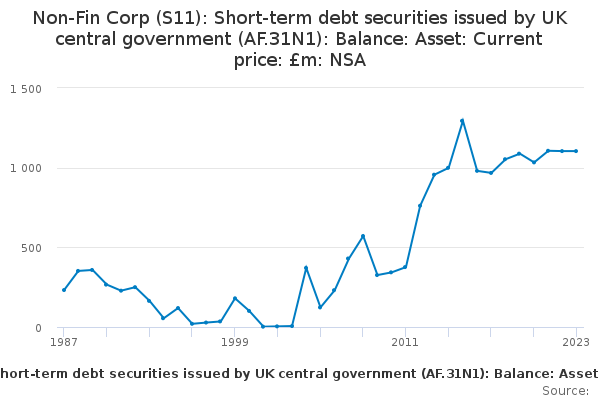 Download this time seriesNon-Fin Corp (S11): Short-term debt securities issued by UK central government (AF.31N1): Balance: Asset: Current price: £m: NSA