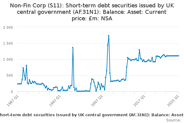 Download this time seriesNon-Fin Corp (S11): Short-term debt securities issued by UK central government (AF.31N1): Balance: Asset: Current price: £m: NSA