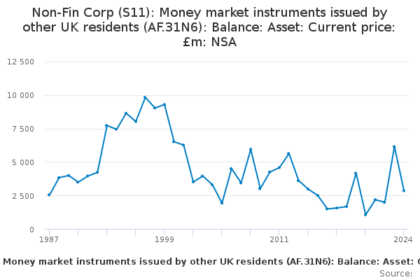 Download this time seriesNon-Fin Corp (S11): Money market instruments issued by other UK residents (AF.31N6): Balance: Asset: Current price: £m: NSA