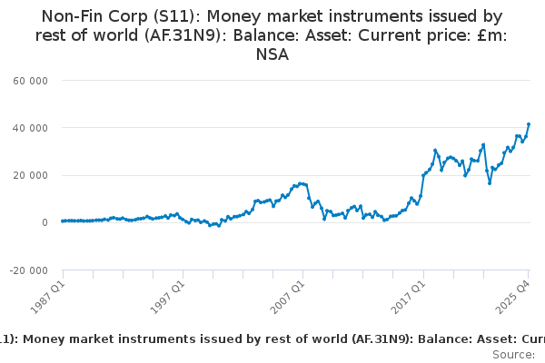 Download this time seriesNon-Fin Corp (S11): Money market instruments issued by rest of world (AF.31N9): Balance: Asset: Current price: £m: NSA