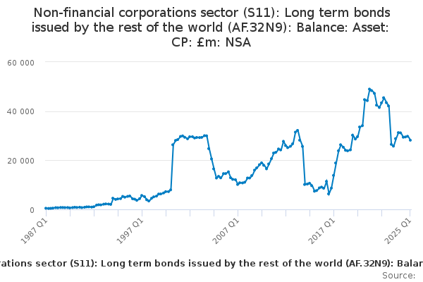 Download this time seriesNon-financial corporations sector (S11): Long term bonds issued by the rest of the world (AF.32N9): Balance: Asset: CP: £m: NSA