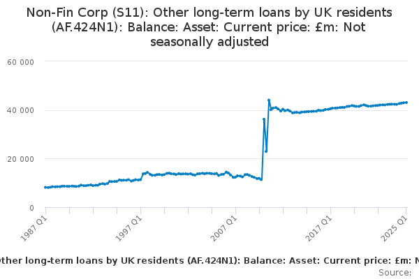 Download this time seriesNon-Fin Corp (S11): Other long-term loans by UK residents (AF.424N1): Balance: Asset: Current price: £m: Not seasonally adjusted