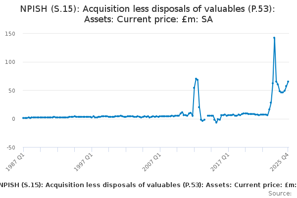 Download this time seriesNPISH (S.15): Acquisition less disposals of valuables (P.53): Assets: Current price: £m: SA