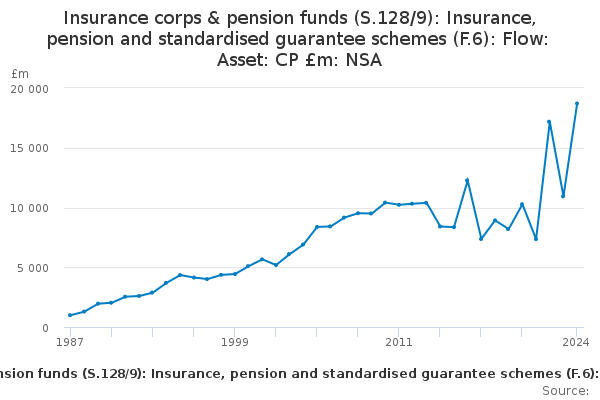 Download this time seriesInsurance corps & pension funds (S.128/9): Insurance, pension and standardised guarantee schemes (F.6): Flow: Asset: CP £m: NSA