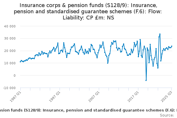 Download this time seriesInsurance corps & pension funds (S128/9): Insurance, pension and standardised guarantee schemes (F.6): Flow: Liability: CP £m: NS